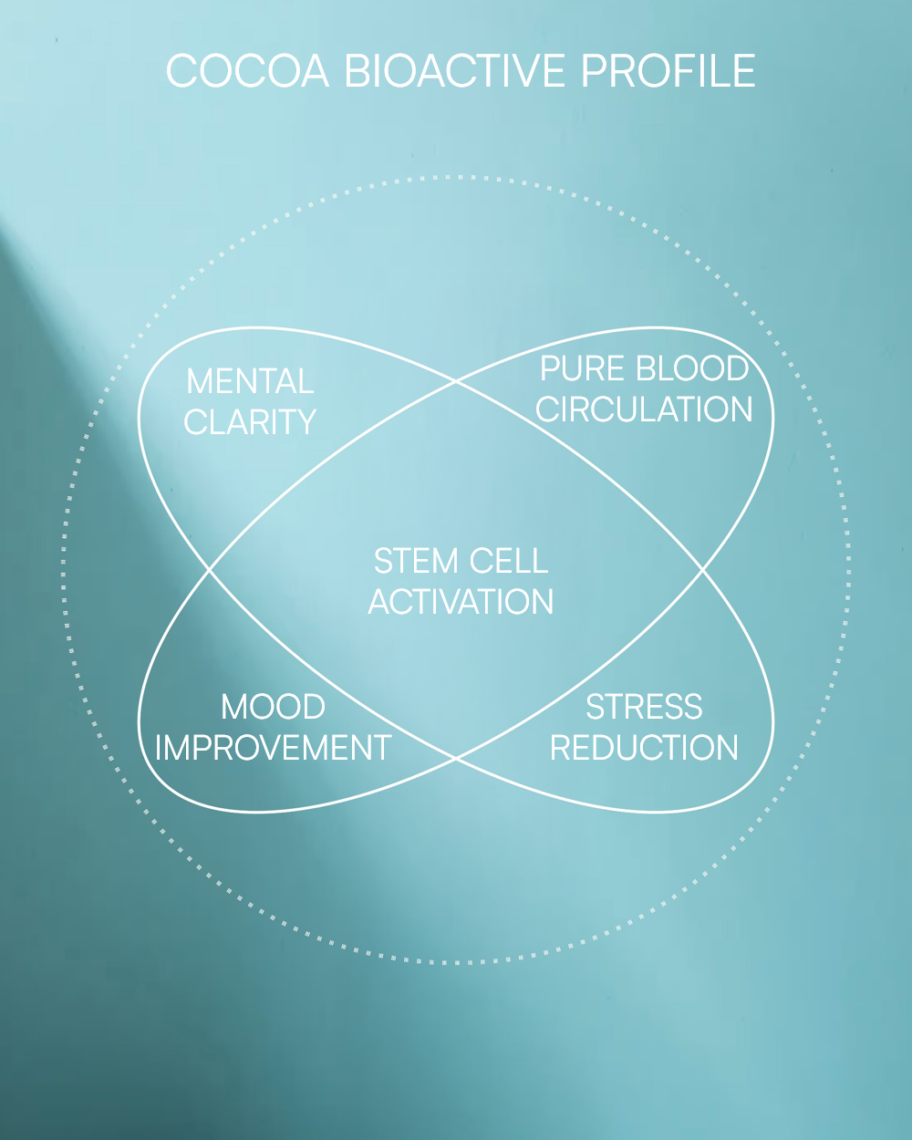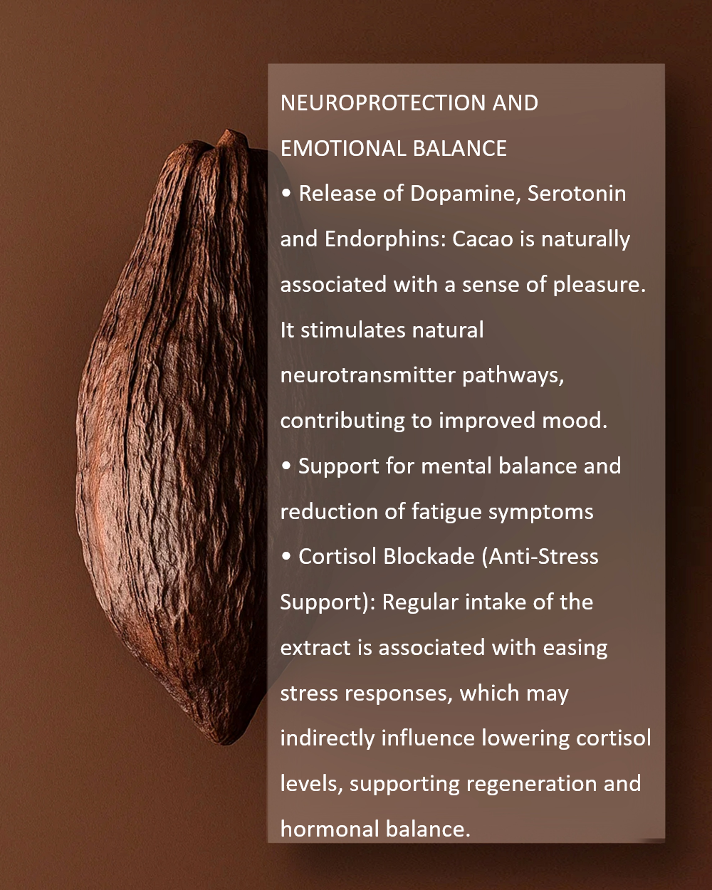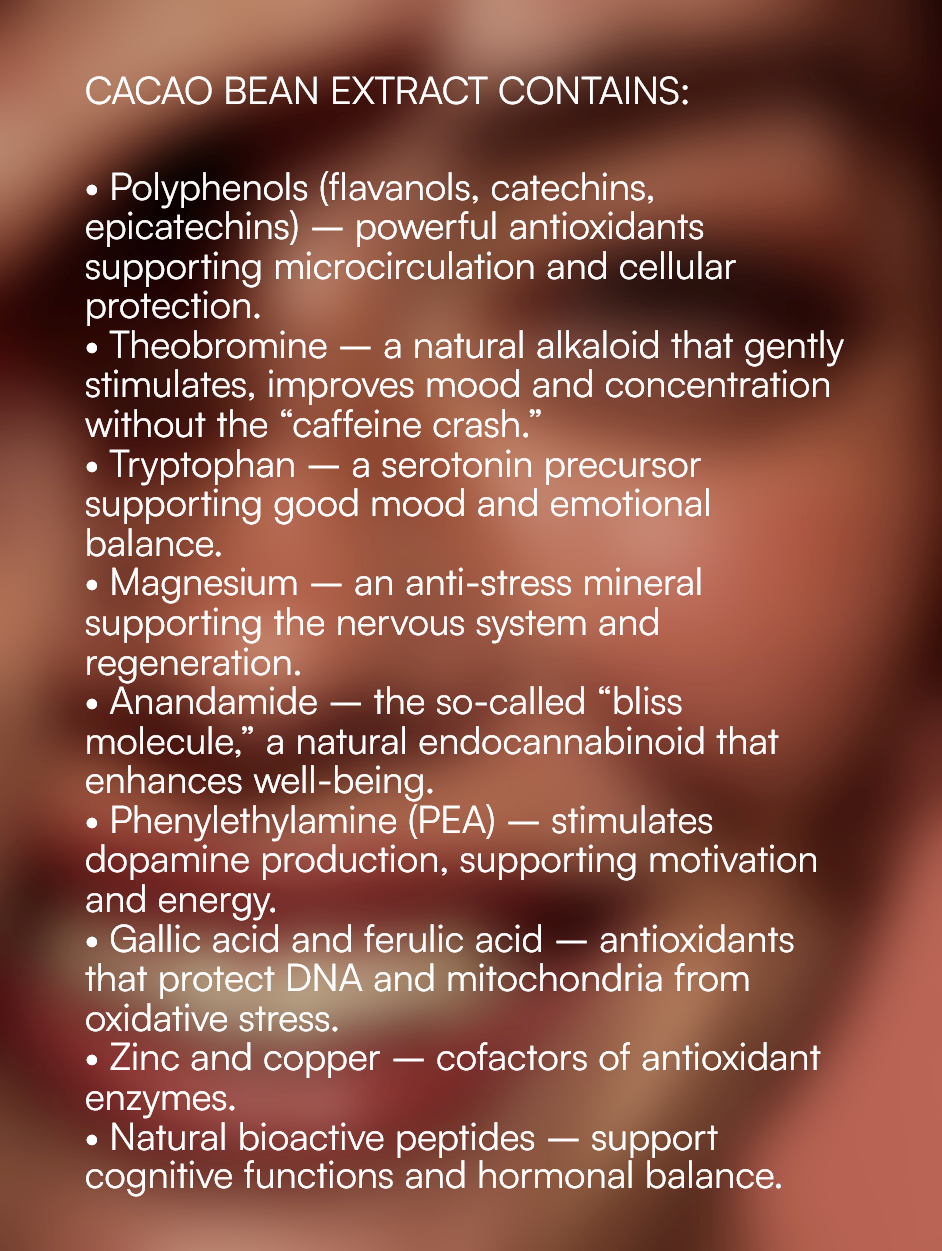 • Supports microcirculation and tissue oxygenation, promoting better concentration and energy. • Gently stimulates without overloading the nervous system (theobromine). • Supports natural stem cell activity and cellular renewal processes. • Helps regulate mood (tryptophan → serotonin, PEA → dopamine, anandamide → natural relaxation). • Strong antioxidant action — protection of DNA, mitochondria, and cell membranes. • Supports nervous system balance and reduction of tension (magnesium + polyphenols). |