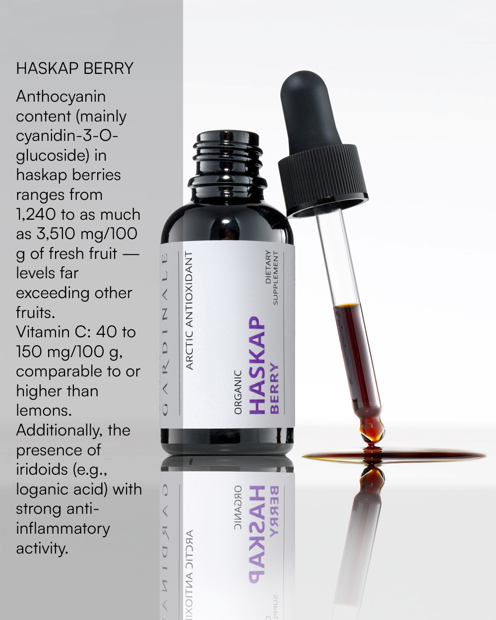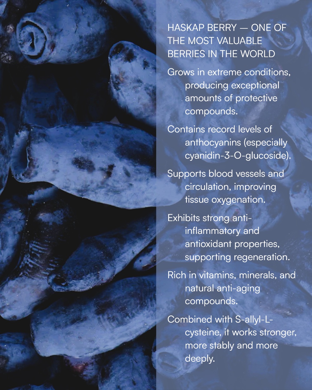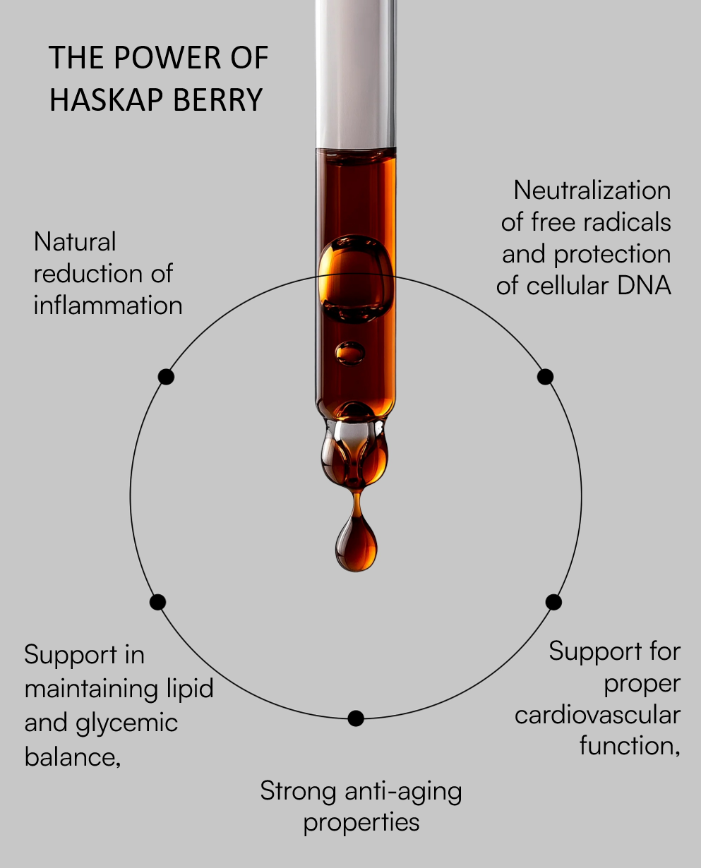 | Extract from ORGANIC HASKAP BERRY (Lonicera caerulea) DER 2:1 | 95% | Anthocyanins (cyanidin-3-glucoside), polyphenols, flavonoids, vitamin C, manganese |