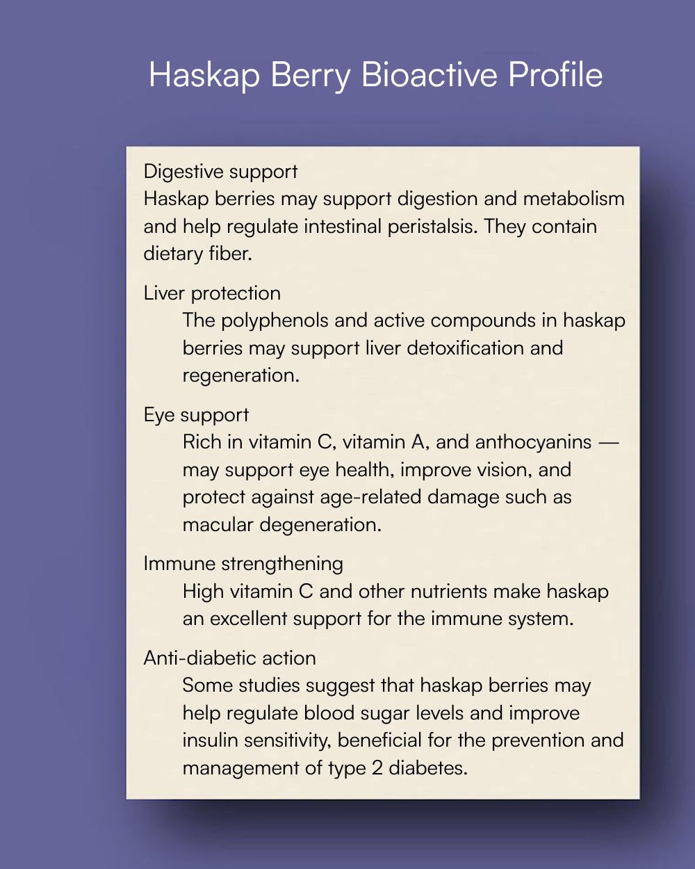 • Strong antioxidant protection (one of the highest among berries) • Supports microcirculation and vessel elasticity • Helps reduce low-grade inflammation • Supports cellular regeneration and anti-aging processes • Favors visual comfort and brain function |